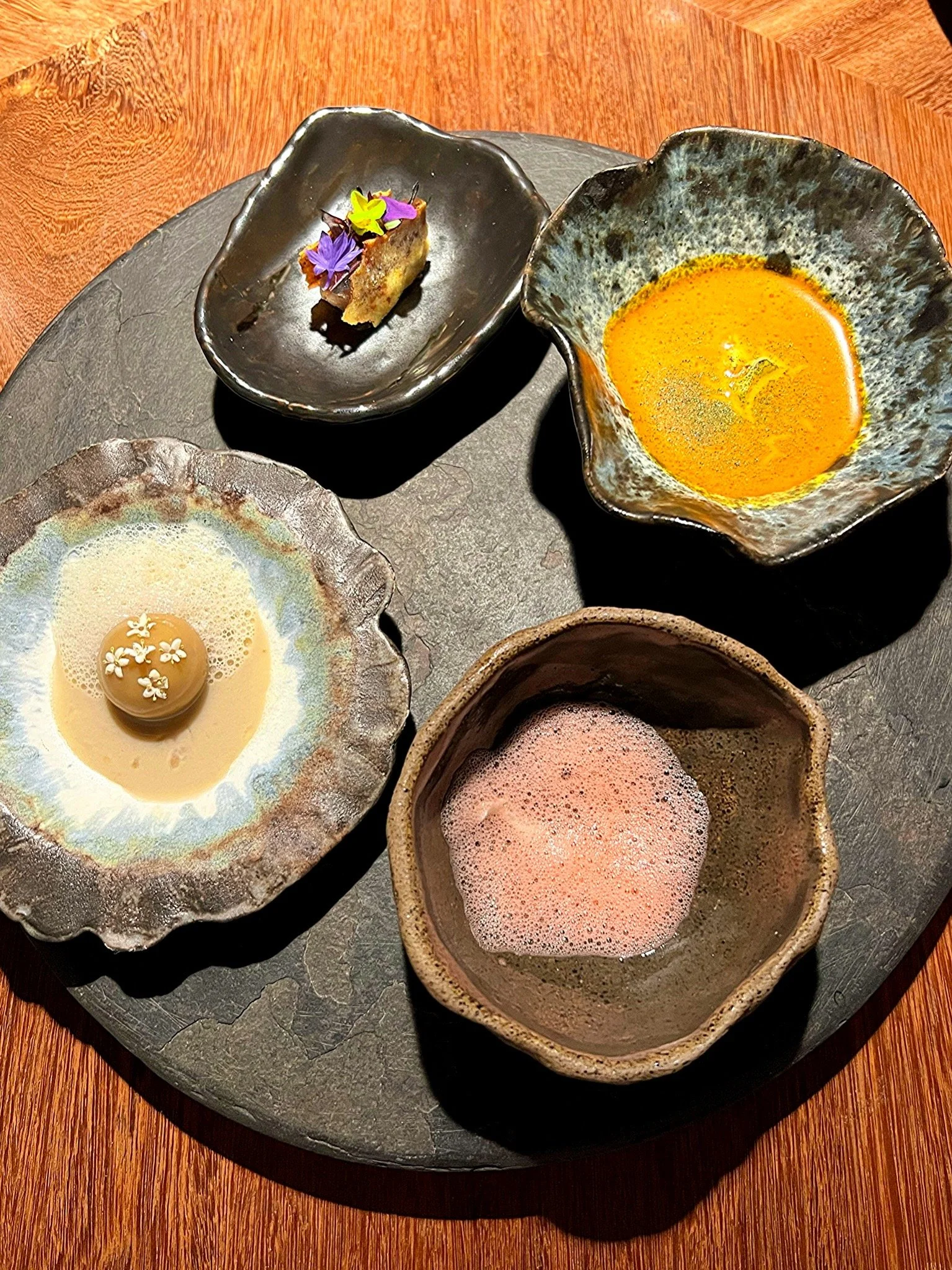 In addition to the cocktail, a number of dishes earned a Great rating including the first two sets of bites that made up the first two courses of the tasting menu. The first set of four bites began with a mussel from the Cartagena area in a pink foam with a citrus gel, fresh coconut milk, and salt from Galerazamba, Colombia. It then moved on to a single small dumpling filled with centolla, known in English as Southern King Crab or Chilean King Crab, in a sauce that represents the ecosystem it comes from. Next was the albacore with crunchy mandioca bites, yuca and an hormiga culona, a type of ant found in the forest. Rounding out the set was an encocado, a soup prepared by the Afro-Colombian communities on the Pacific Coast that is made with dried shrimp, fresh coconut milk, fresh herbs, and a snail. The soup was one of my favorite bites and the snail gave the soup a wonderful, earthy taste.